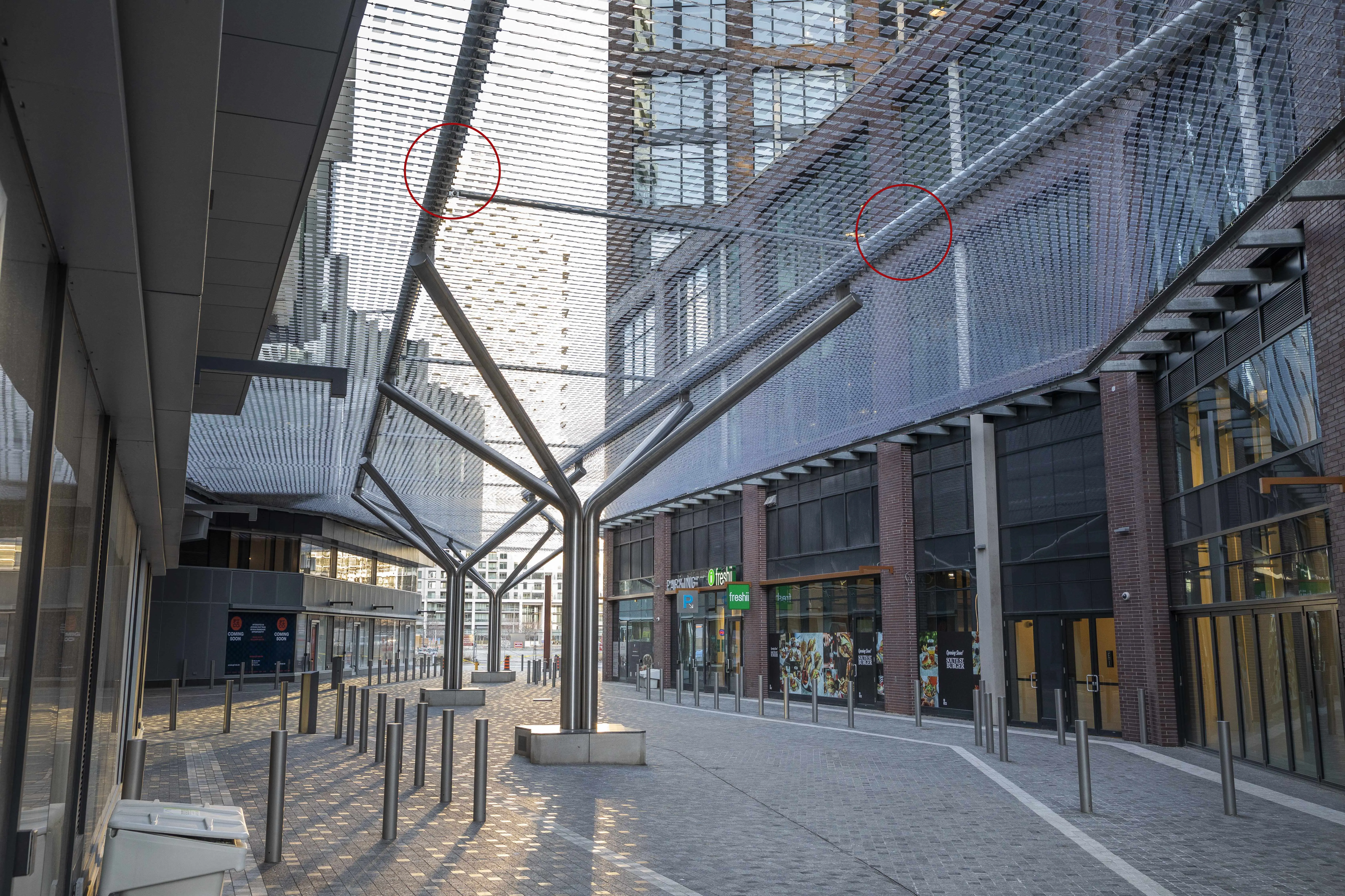 The structure includes tree-like features that support a structural steel horizontal canopy featuring over 4.4km of steel cables and 26,000 polycarbonate panels. Each panel reacts with the wind, swaying and spinning to mimic the waves and reflectivity of Lake Ontario. CAST CONNEX Diablo Bolted Splices (DBS) are strategically placed along the horizontal HSS canopy members by the steel fabricator, Heavy Experience.