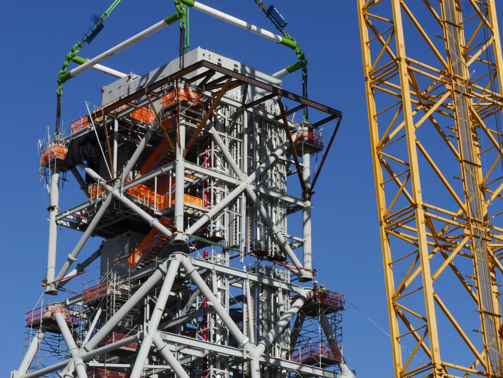 ML2 was constructed using a modular construction strategy that allowed different sections of the tower to be built and outfitted in parallel. This approach improved safety by reducing the need for high-elevation work and streamlined the overall schedule by enabling simultaneous fabrication and assembly. Once completed, the modules were transported to the project site and stacked to form the final launch tower.